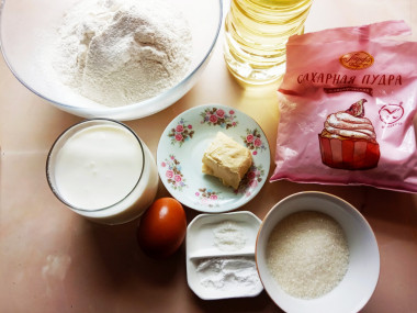 Как сделать пышные пончики на кефире без дрожжей, жареные в масле на сковороде? Подготовьте необходимые продукты. Все ингредиенты должны быть комнатной температуры. Кефир можно брать любой жирности. Вместо кефира можно использовать простоквашу. Сливочное масло растопите любым удобным способом. Как правильно это сделать, читайте в конце рецепта.