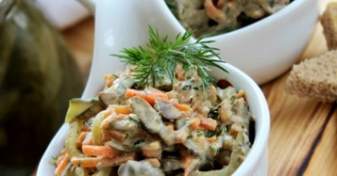 Такой салат с куриной печенью прекрасно подойдет на ужин, очень сытно. Знаю немного другой вариант салата с куриной печенью и морковкой по корейски.