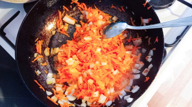 На сковороде на среднем огне разогрейте растительное масло. О том, как правильно выбрать растительное масло, читайте в отдельных статьях, ссылки в конце рецепта. Обжарьте на сковороде сначала лук до прозрачности, потом добавьте морковь. Готовьте при помешивании на среднем огне до готовности, особо поджаривать не нужно, просто до мягкости моркови.
