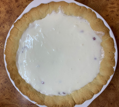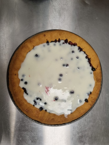 Сверху залейте начинку сметанным кремом и разровняйте. Поставьте пирог в холодильник на 3-4 часа.