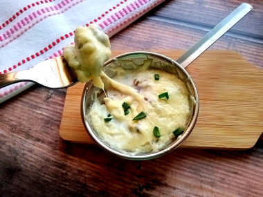 Грибы с луком обжаривала до выпаривания жидкости, при этом шампиньоны стали румяными. Формочки я не смазывала, т. к. грибы жарились на масле. Соус делала так, как написано в рецепте. Только мне показалось, что он получился жидковатым. Но в духовке соус хорошо загустел. За 15 минут сыр отлично расплавился, но до румяного состояния не доводила, чтобы он не высох.