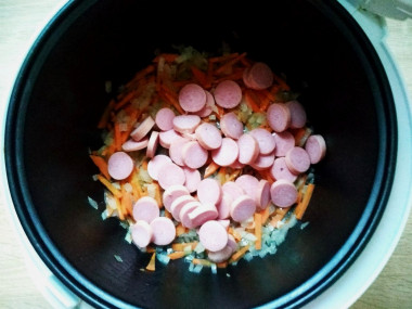 Затем выложите к овощам сосиски, перемешайте. Обжарьте все вместе еще пару минут.