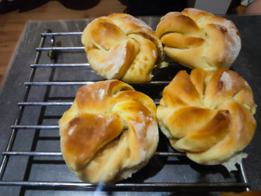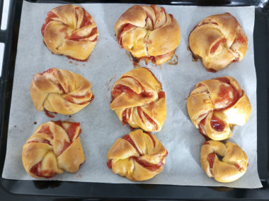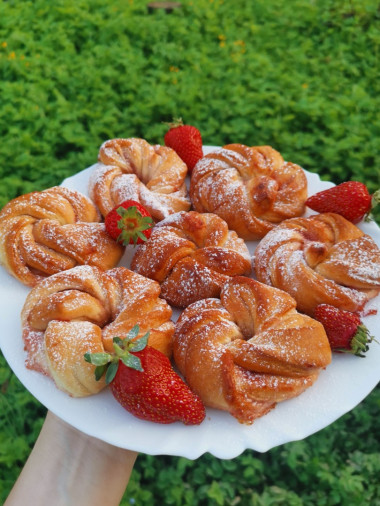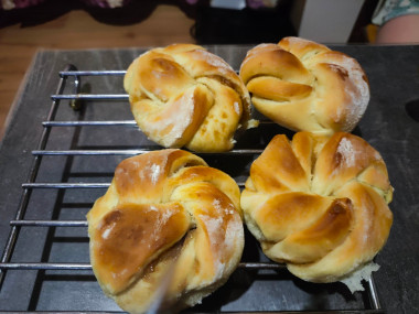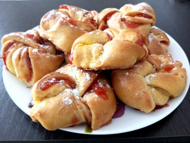 Дрожжевые булочки я пеку не так часто, хотя с дрожжевыми изделиями я знакома. Сделала тесто по рецепту. Оно получилось очень мягкое и эластичное. Тесто хорошо поднялось, я раскатала его в пласт и принялась смазывать. Обычно использую для пирогов варенье собственного приготовления, но к весне оно у меня закончилось и я купила в магазине клубничное повидло. Распределялось по тесту оно плохо - пластами. А когда полоски теста начала скручивать жгутом, повидло стало вылезать из теста. Свою ошибку я поняла - нужно было повидло разбить в блендере, чтобы оно было однородным и делать слой повидла потоньше. Но, дело было уже сделано. Поставила булочки в разогретую духовку и с ужасом ждала результата. Через 25 минут булочки были готовы и, в принципе, очень даже неплохие на вид. Конечно, они не такие красивые, как у автора рецепта, но вполне презентабельные. Жаль только, что мало. В следующий раз испеку порцию побольше. Булочки мягкие и вкусные. Автору спасибо за рецепт!