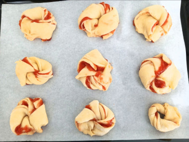 Каждую полоску перекрутите 3-4 раза и сверните колечком. Концы хорошо соедините, чтобы при выпечке булочки не развернулись.