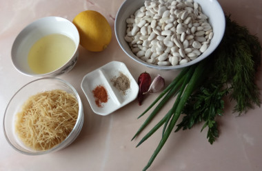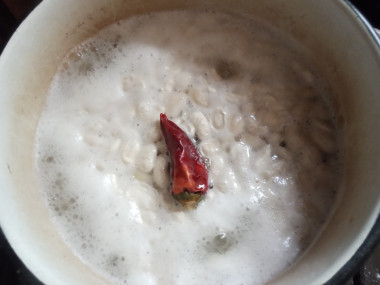 Поставить на огонь, дать повариться примерно один час. Мягкую готовую фасоль достать из бульона, помять, чтобы получилось пюре, потом положить обратно в кастрюлю. Далее в пюре налить растительное масло, добавить тмин, черный и красный молотый перец, посолить. Поставить на огонь, дать закипеть и сразу же добавить мелкую вермишель. Поварить еще 10 минут.