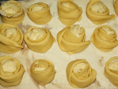 То же самое проделайте с остальным тестом. Выложите розы на противень застеленный пергаментной бумагой. Дайте им постоять минут 25-30, накрыв полотенцем. Затем поставьте в заранее разогретую до 180 градусов духовку и выпекайте до готовности примерно 20-30 мин. Время указано приблизительно, ориентируйтесь на особенности своей духовки.
