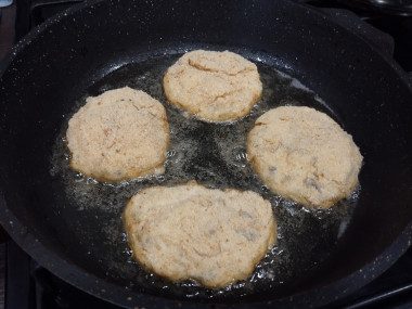 Разогрейте сковороду, влейте в нее растительное масло. Выложите в масло запанированные котлеты. У меня получилось 8 штук.