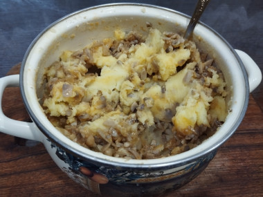 Затем всыпьте в пюре муку и снова разомните его. Количество муки может отличаться от заявленного в рецепте, смотрите по консистенции пюре — оно не должно стать слишком тугим. Добавьте в него обжаренные грибы с луком и хорошо перемешайте. Дайте пюре немного остыть, а затем вбейте в него яйцо. И снова хорошо вымесите.