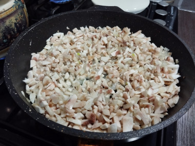 А тем временем займитесь грибной начинкой. Сначала очистите лук и нарежьте его мелкими кубиками.