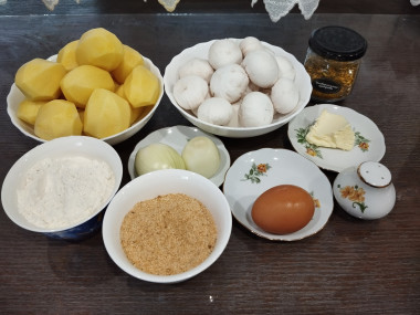 Как сделать картофельные котлеты с грибами? Подготовьте продукты. В качестве грибов быстрее и удобнее всего использовать шампиньоны. Но вообще подойдут любые грибы — как лесные, так и магазинные.
