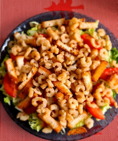 Приготовила легкий и потрясающе вкусный салат! Всегда ела салат "Цезарь" с курицей или ветчиной, но вот, оказывается есть на сайте салат Цезарь с креветками классический. Очень вкусно и необычно! Спасибо за рецепт!