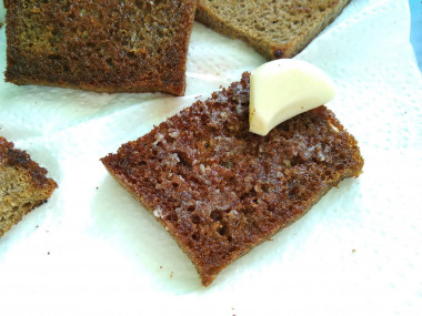 Сегодня у нас на обед был борщ и мне так захотелось чего-то пряного или острого к нему вприкуску. Нашла рецепт гренок с чесноком. Как раз дома был ржаной хлеб. Нарезала его, срезала корочки и пожарила в раскаленном масле. Еще со вчерашнего дня оставался кусочек черного бездрожжевого хлеба в виде колбаски. Он был с обсыпкой из черного и белого кунжута и семян подсолнечника. Тоже нарезала его на кусочки и пожарила. Ломтики еще горячими натерла чесноком, это самый главный ингредиент здесь) Аромат потрясающий! сверху посыпала укропом, петрушки не было. Гренки очень вкусные! А те, что с обсыпкой не только вкусные, но и необычные, красивые и вкус семенами дополняется. Чесночные гренки с борщом отлично подходят друг к другу. Спасибо за отличный рецепт!