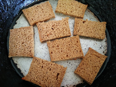 Выложите хлеб на сковороду с раскаленным растительным маслом и поджарьте до золотистой корочки с обеих сторон. Выложите хлеб на бумажное полотенце, чтобы стек лишний жир. Чтобы гренки получились более ароматными, можете добавить в кипящее масло смесь специй, молотый перец. Я этого не делала.