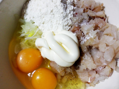 В миске соедините нарезанную кусочками рыбу, лук, яйца. Массу посолите, поперчите и перемешайте.