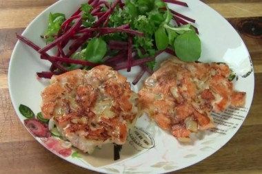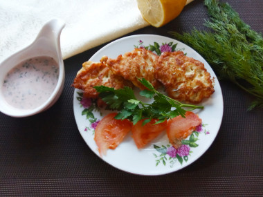 В сковороде на среднем огне разогрейте растительное масло. Столовой ложкой выложите в раскаленное масло рыбную массу и сформируйте небольшие котлетки. У меня получилось 8 котлет. Жарьте рыбные котлеты примерно по 3-5 минут с каждой стороны до золотистого цвета. Точное время обжарки зависит от степени нагрева, от толщины котлеток.