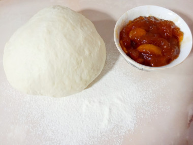 Тесто у меня подошло. Переложите подошедшее тесто на стол, вымесите его руками еще раз и разделите на 4-5 равных частей.