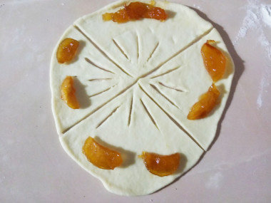 На край каждого кусочка выложите по ложке повидла. У меня было яблочное. Лучше берите густой джем или повидло, иначе будет вытекать.