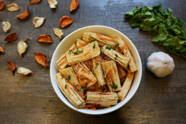 6. В закуску добавляем соль и приправу для морковки по-корейски, а также наливаем оливковое масло, уксус и соевый соус. Всё тщательно перемешиваем.