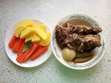 Для бульона я взяла свежую говядину на косточке, чтобы и бульон вкусный был и мяса всем досталось. Первый бульон слила, помыла кастрюлю и мясо, чтобы не было сварившегося белка. Болгарский перец и лук сварила вместе с мясом на втором бульоне, чтобы они отдали свой вкус. По готовности мяса добавила картошку, разрезанную на 4 части и морковь, которую тоже разрезала пополам и на 4 части. Главное, чтобы все было крупно). Из специй добавила душистый перец горошком, паприку и сушеную зелень петрушки. Помидоры на добавляла, т. к. у нас их никто не любит в супе. Варила суп на медленном огне до готовности овощей.