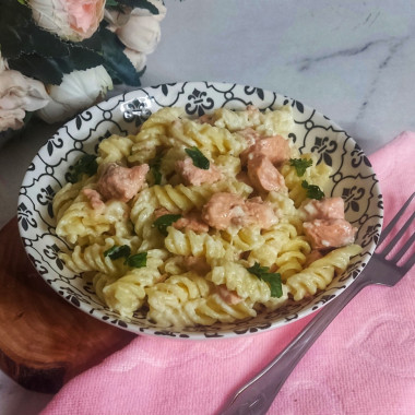 У меня была красная рыба кижуч,а сын попросил на ужин макароны, он у меня любитель макарон. Нашла рецепт: макароны с красной рыбой в сливочном соусе. Рецепт заинтересовал своей простотой и аппетитным видом!