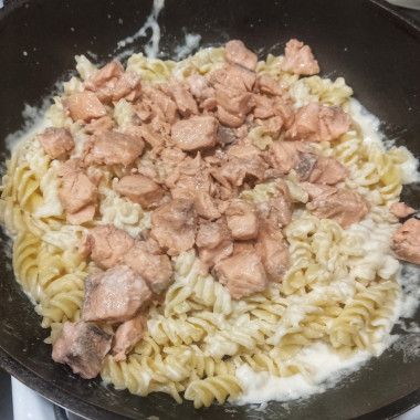 Добавьте в сковородку со сливочным соусом макароны и кусочки красной рыбы. Аккуратно всё перемешайте.