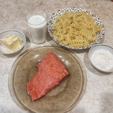 Как сделать макароны с красной рыбой в сливочном соусе? Прежде всего, подготовьте все необходимые ингредиенты, которые указаны в рецепте. Если у вас замороженная рыба, то выньте её заранее из морозильной камеры и оставьте при комнатной температуре до полного оттаивания. Какие макароны лучше использовать? Можно взять любые на ваш вкус, предпочтительно для этого рецепта использовать тальятелле (длинные тонкие широкие макароны).