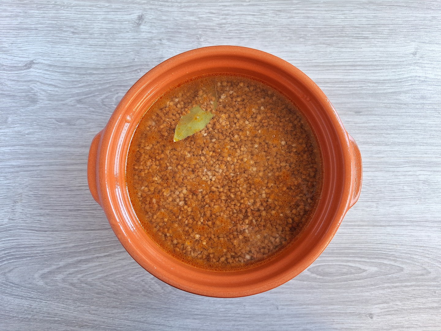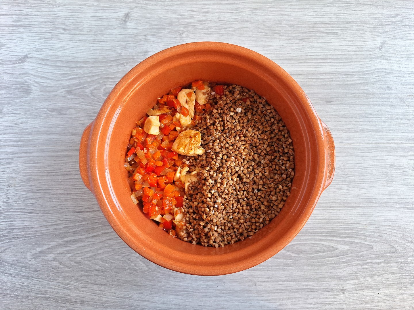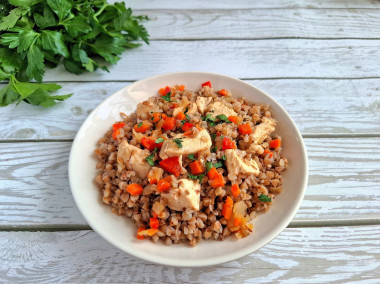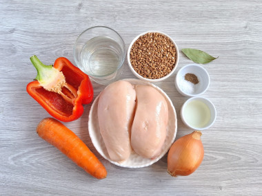 На сковороде сначала обжарила куриную грудку, нарезанную средними кусочками. Затем добавила овощи. Лука-порея у меня нет, заменила его репчатым и добавила красный болгарский перец для цвета и сочности. Обжаренное мясо с овощами сложила в горшочек, сверху распределила промытую гречку. Воды взяла 2,5 стакана на 1,5 стакана сухой крупы. Для аромата добавила лавровый листочек. Блюдо получилось сочным, но без лишней жидкости.