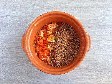 Добавьте половину гречки и залейте стаканом воды, посолите. Поставьте в нагретую до 200 градусов духовку на полчаса, потом убавьте жар духовки до 100 градусов и томите кашу до впитывания и выпаривания жидкости.Шаг 6: