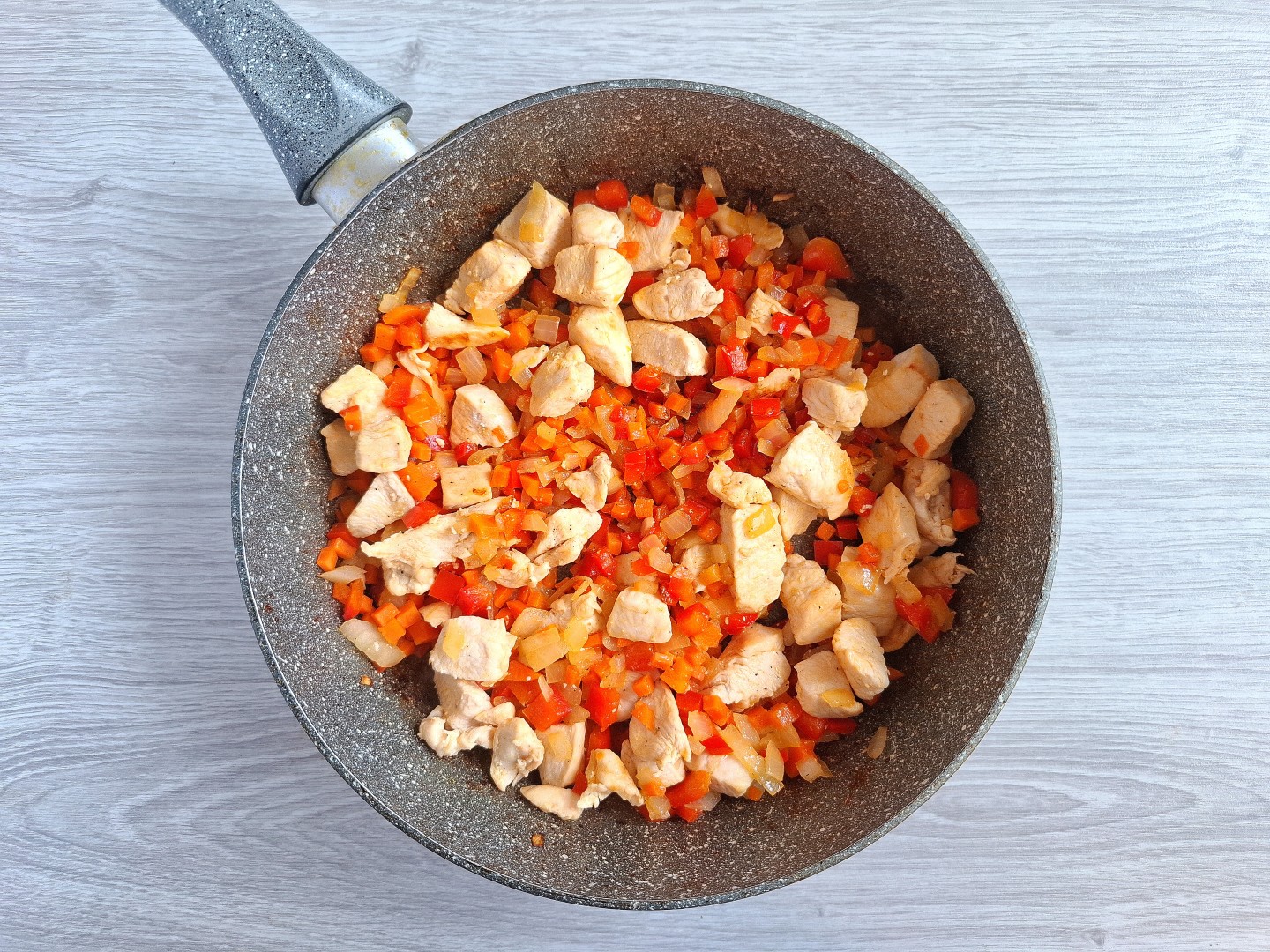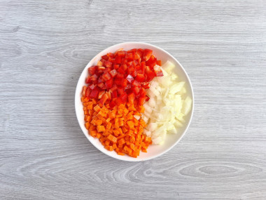 На масле обжарьте лук, морковь, курицу, нарезанные мелкими кусочками.Шаг 3: