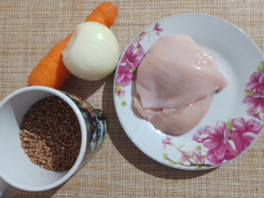 Как сделать гречку с курицей в горшочке? Возьмите лук-порей, морковь, куриное филе, гречку, подсолнечное масло, соль.