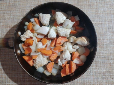 На масле обжарьте лук, морковь, курицу, нарезанные мелкими кусочками.