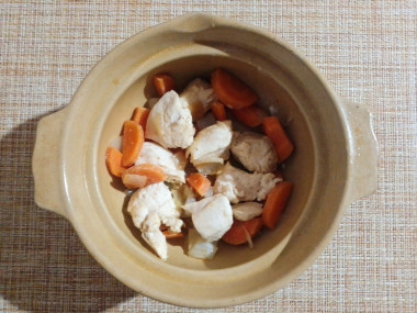 В один горшочек выложите половину курино-овощной обжарки, во второй аналогично. Горшочки у меня объемом 500 мл.