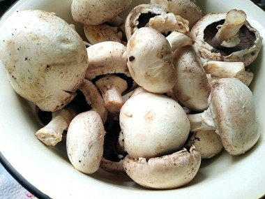 Покупайте свежие шампиньоны среднего размера, снежно-белого цвета без пятен, повреждений, запаха гнили. На ощупь они не должны быть скользкими. Тщательно промойте грибы от грунта под струей теплой или холодной воды. Вырежьте подпорченные места, если они есть. Миниатюрные грибочки размером до 2 см чистить совершенно не обязательно, достаточно их хорошо промыть. Более крупные шампиньоны рекомендуется чистить от пленочек.