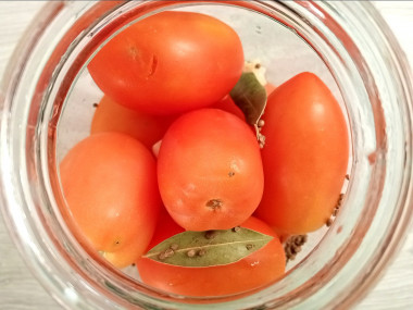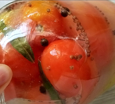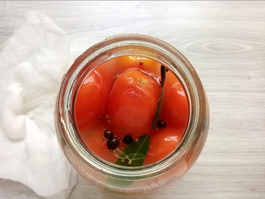 На рынке выбрала крепкие почти зрелые помидоры. Помыла их, обсушила и наколола зубочисткой. Укропа у меня не было, поэтому заменила его на зерна кориандра. И, конечно, взяла лавровые листочки, гвоздику и душистый перец. Зубчики чеснока нарезала на пластинки. Заранее развела рассол и залила им помидоры со специями. Банку накрыла марлей, закрепила ее резинкой и оставила на столе на пять дней. На четвертый день рассол помутнел и появился характерный аромат брожения. Вечером пятого дня убрала банку в холодильник, там она простояла еще дня три. Марлю решила на снимать, чтобы помидоры "дышали".