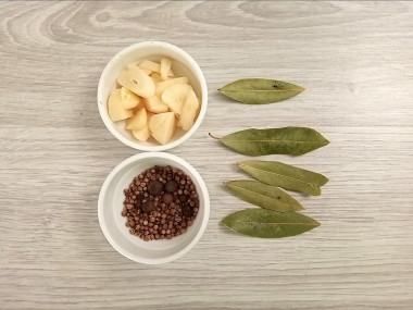 В чистые и стерилизованные банки (у меня литровые) уложите на дно соцветия укропа, зубчики чеснока, гвоздику, душистый перец и лавровый лист.
