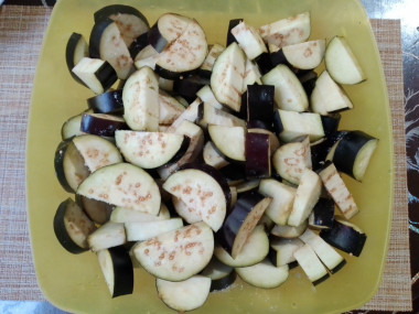 Отправьте кусочки в глубокую посудину, я использовала кастрюлю, но можно взять большую чашку. Посыпьте баклажаны двумя столовыми ложками соли и хорошо перемешайте. Оставьте синенькие настояться около 30 минут (за это время соль вытянет из них горечь).