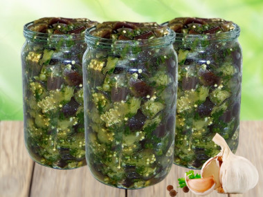 Из указанного количества компонентов у меня вышло две баночки по 700 миллилитров. Хранятся такие баклажаны несколько месяцев.