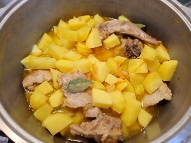 Готовила в большом казане для удобства. Порядок обжарки немного изменила. Решила сначала обжарить куски кролика с мукой, а затем добавила много лука, нарезанного полукольцами. Жарила до золотистого цвета. Далее выложила морковь, у меня замороженная. Картошку нарезала средними кусочками, промыла и выложила в казан. Влила горячей воды так, чтобы она была чуть ниже картошки. Все это посолила, добавила овощную приправу и лавровые листочки. Сметану не стала использовать, т. к. готовила большой объем. Блюда со сметаной желательно съедать сразу. Но хочу заметить, что кролик и овощи тушеные со сметаной, получаются очень нежные и вкусные!