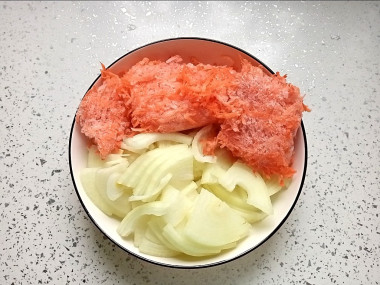 Луковицы порезать полукольцами, а чеснок измельчить кружочками.