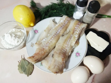 Калорийность продуктов: Филе минтая, Куриные яйца, Зелень, Сливочное масло, Соль, Перец горошком, Лавровый лист, Вода, Пшеничная мука, Лимонный сок