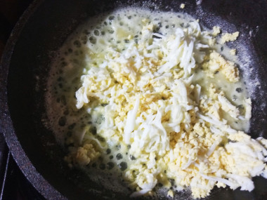 Добавьте измельченные яйца. Жарьте постоянно помешивая.