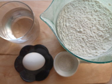 Яйцо взболтайте, всыпьте в него соль и влейте воду. Ее предварительно подогрейте до теплого состояния, тогда тесто замесится быстрее и легче. Перемешайте жидкие ингредиенты.