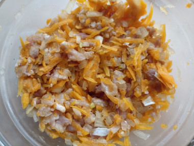 Сложите мясо, тыкву и лук в миску, добавьте соль и перец, перемешайте. Влейте в фарш немного холодной чистой воды и хорошо перемешайте — вода сделает начинку сочнее.
