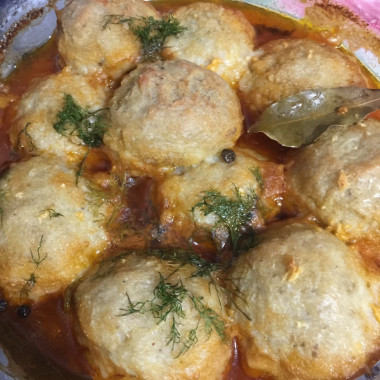 6. Выкладываем получившийся соус в толстостенную кастрюлю, поверх него размещаем тефтели и очень аккуратно заливаем кипятком. Приправляем горошинами перца, чесноком выдавленным через пресс, лавровыми листиками.