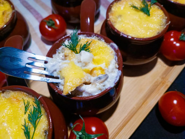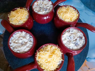 Возьмите формочки для запекания - несколько маленьких кокотниц или одну большую. Уложите в них курицу с грибами. Данного количества продуктов хватит на 6 средних кокотниц или 8 маленьких. Мои размером 10*5 см.