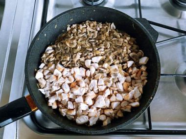 Положите к грибам куриное мясо, перемешайте, и через пару минут снимите с огня.