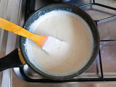 Приготовим соус. Поставьте сотейник или сковороду с толстым дном на небольшой огонь. Растопите в ней масло. Всыпьте муку, соль, перец и мускатный орех. Активно перемешайте и слегка поджарьте муку в течении минуты.