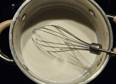 Тонкой струйкой влейте сливки. При этом активно перемешивайте массу, добиваясь однородности. Также при постоянном помешивании доведите ее до загустения.