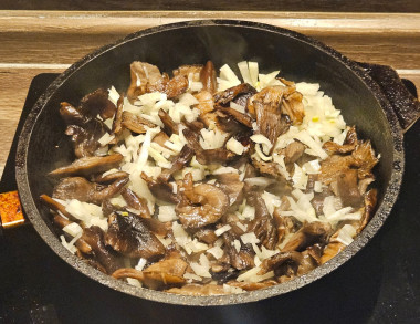 Сковороду разогрейте на небольшом огне. Налейте на нее масло. Выложите лук. Обжаривайте лук в течении 5 минут до прозрачности. Затем добавьте в него грибы. Грибы жарьте на среднем огне, изредка перемешивая. Они сначала отдадут много жидкости, а затем поджарятся до румяной корочки. В конце жарки добавьте соль и перец.