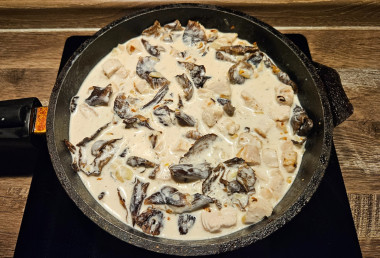 Добавьте соус в сковороду к курице с грибами. Перемешайте.